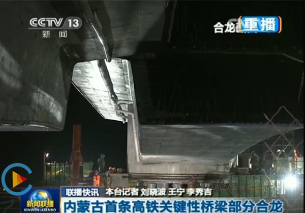 The 40+56+40mcontinuous girder for the bridge on Mengguyingyin River of Zhangjiakou to Hohhot Railway project which crossing the Jining to Baotou second railway had turned to right position successfully.