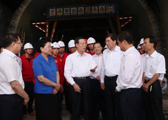 張高麗在京張鐵路八達(dá)嶺長(zhǎng)城站施工現(xiàn)場(chǎng),察看隧道工程進(jìn)展情況,中鐵咨詢總經(jīng)理李壽兵陪同。(圖片來(lái)自新華社)