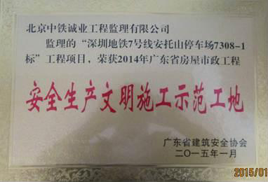 近日,中鐵誠業(yè)監(jiān)理公司深圳地鐵7號線項目部榮獲“2014年下半年廣東省建筑安全協(xié)會雙A級安全文明標準化工地和安全生產(chǎn)文明施工示范基地”榮譽稱號,受到廣東省建筑安全協(xié)會通報表彰。中鐵誠業(yè)監(jiān)理公司在深圳地鐵7號線7208標中被深圳地鐵公司授予“優(yōu)勝單位”稱號,在7208監(jiān)理部內(nèi)張占彪榮獲“優(yōu)秀總監(jiān)理工程師”稱號,樊立魏、孟繁玉、李福建榮獲2014年深圳地鐵7號線“優(yōu)秀監(jiān)理工程師”稱號。
