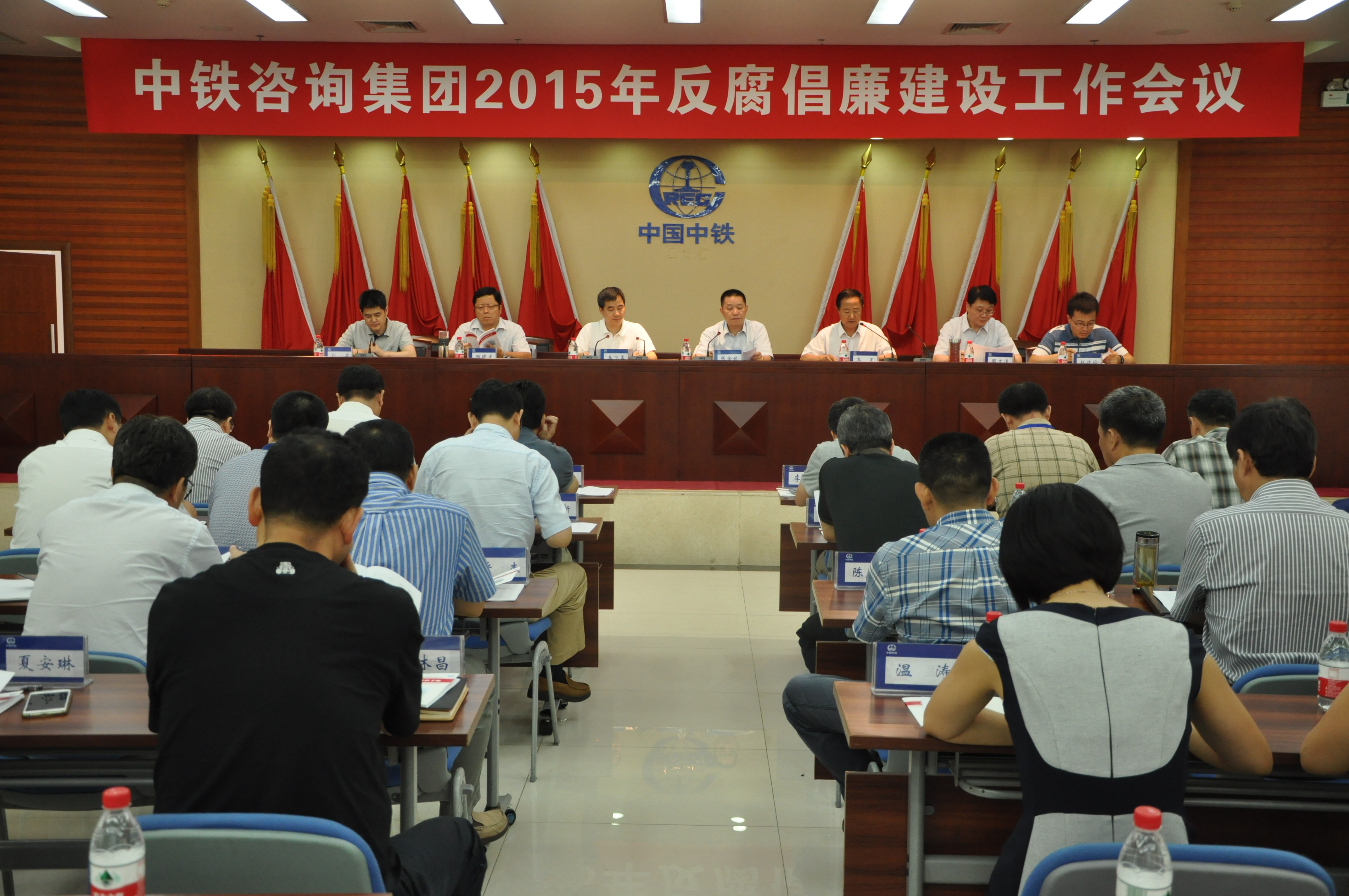 2015年7月29日上午,中鐵咨詢集團在1301會議室召開反腐倡廉建設工作會議暨黨風廉政建設和反腐敗工作聯席會議。公司黨委書記、董事長張金武、紀委書記王飛孟,公司黨風廉政建設和反腐敗工作聯席會議成員,公司紀委委員、紀檢員,各單位黨委書記、紀委書記,各直屬黨總支、黨支部書記、紀律委員(異地分公司、子公司通過視頻)共59名同志參加了會議。