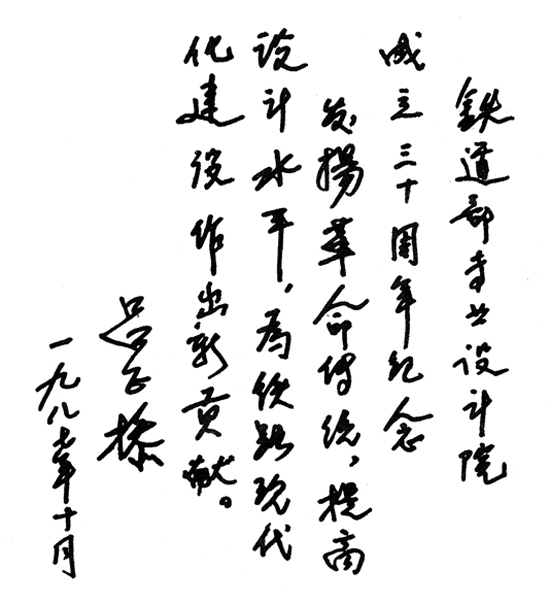 原全國(guó)政協(xié)副主席、鐵道部部長(zhǎng)呂正操題詞(賀鐵道部專業(yè)設(shè)計(jì)院成立三十周年)
