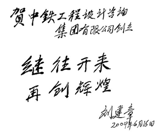 原鐵道部部長(zhǎng)劉建章題詞(賀中鐵工程設(shè)計(jì)咨詢集團(tuán)有限公司成立)