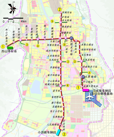 太原市軌道交通1號(hào)線一期工程起于西山礦務(wù)局,終于龍城大街東站,于太原市內(nèi)呈倒“L”形分布,東西向沿迎澤大街,途經(jīng)客運(yùn)西站、理工大學(xué)、大南門、柳巷、五一廣場(chǎng)、太原站等客流集中點(diǎn),南北向沿朝陽街、太行路、馬練營(yíng)路敷設(shè),途經(jīng)朝陽街服裝城、雙塔公園、東太堡、太原南站綜合交通樞紐等地。1號(hào)線一期工程是聯(lián)系迎澤、武宿兩個(gè)市級(jí)中心和太原站、太原南站兩個(gè)鐵路交通樞紐的骨干線路,線路全長(zhǎng)約24.07km,設(shè)橋梁1座,長(zhǎng)約0.215km,其余全為地下線;共設(shè)置車站21座,全部為地下站,在線路西端設(shè)西山礦務(wù)局停車場(chǎng)1座、南端設(shè)馬練營(yíng)車輛段及綜合維修基地1座,全線網(wǎng)共享控制中心1個(gè)。太原市軌道交通1號(hào)線于2010年完成工程可行性研究報(bào)告初稿,擬采用6輛編組的B型車、1500V接觸網(wǎng)供電,估算總投資157.9億元,計(jì)劃2013年開工建設(shè),2017年建成通車。1號(hào)線是太原市先期啟動(dòng)建設(shè)的軌道交通線路之一,是一條客流需求和規(guī)劃引導(dǎo)兼顧的大運(yùn)量線路,在太原市軌道交通線網(wǎng)中具有重要的地位和作用,其建設(shè)可改善迎澤和武宿兩大市級(jí)中心的居民出行條件,緩解中心城區(qū)交通壓力,對(duì)引導(dǎo)沿線城市健康有序發(fā)展、土地合理使用及加快城市化進(jìn)程等均有積極促進(jìn)作用。